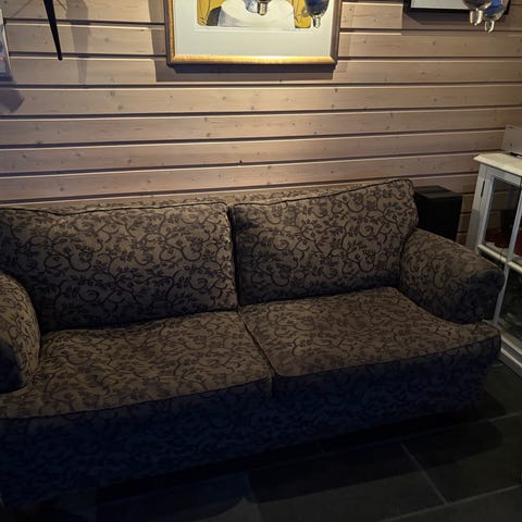 Swedese sofa i blått stofftrekk. Sofaen har avrundede former, knappdetaljer i ryggen og rette seteflater. Understell med rette ben i lyst treverk. Designet av Henning Koppel. Passer som sittemøbel i stue, gjesterom eller andre oppholdsrom.