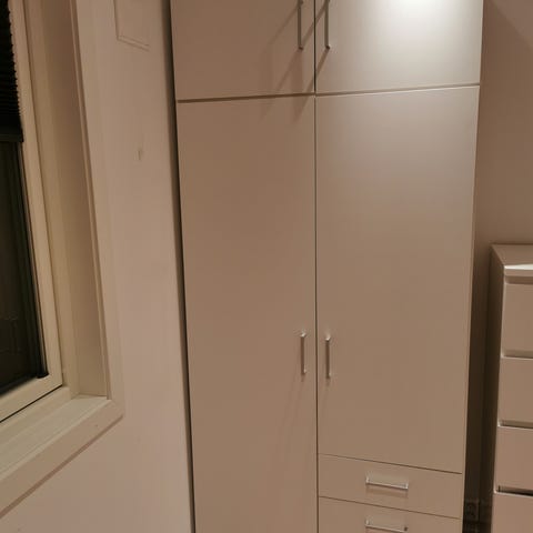 Garderobeskap i hvit utførelse med tre dører. Skapet har kombinasjon av hylleløsning og hengeløsning med klesstang. Midtdøren har speil. De to ytterste seksjonene har hver sin dør med slette fronter og enkle håndtak. Skapet er egnet til oppbevaring av klær, yttertøy og tilbehør i gang, soverom eller bod.