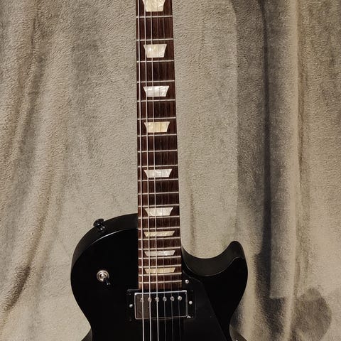 Sort Gibson Les Paul Studio 2011 modell. Noen skraper nederst på kroppen, ellers hel og pen. Plekterbrett ikke montert, men medfølger. Nypolerte bånd, nyoljet gripebrett og nye Ernie Ball strenger, 010-046. Kommer i strøken original kasse.