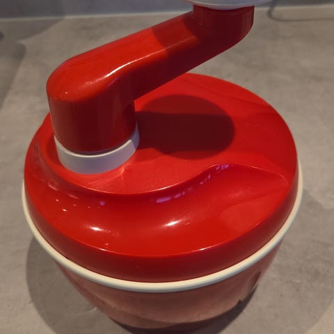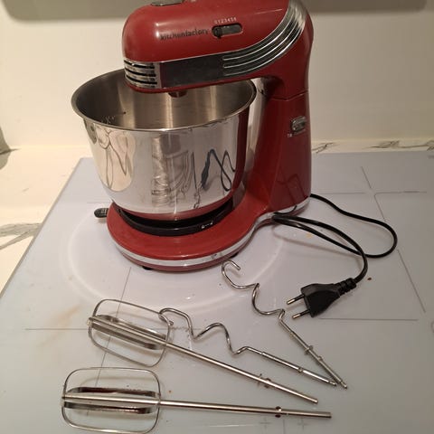 Selger en vintage Kenwood chef kjøkkenmaskin i rødlig farge. Maskinen leveres med to hvite mikseboller, en i glass/porselen(?) og en i plast. Tilbehør som ballongvisp, deigkrok og k-visp følger med. Hastigheten justeres med bryter på siden. Egner seg til vanlig kjøkkenbruk som elting av deig, pisking og røring av ulike typer mat. Denne er gammel, men fungerer fortsatt fint. Lekker noe olje på benken under bruk, men det er minimalt.