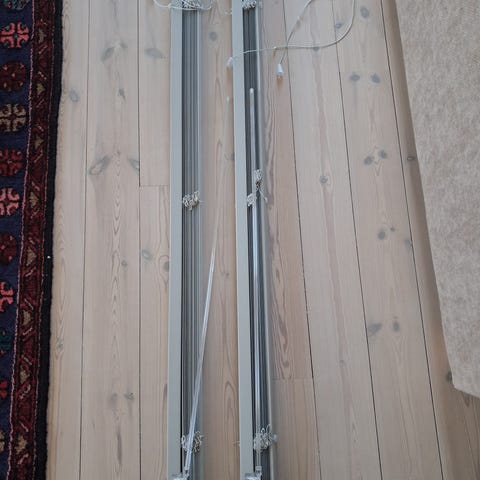 Enkle persienner pent brukt av ukjent opphav, men trolig IKEA. Alt følger med. Skruer er noenlunde gamle, de er ikke rundet ut og vil funke til gjenbruk, men noen noe små treskruer er nok å foretrekke:)