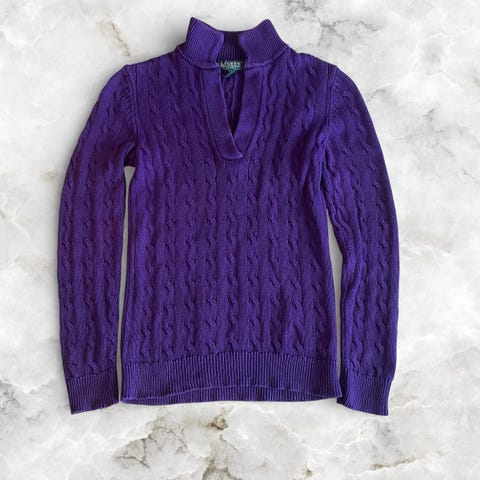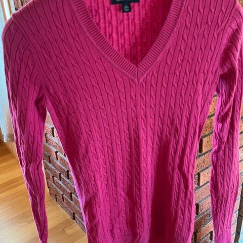 Ralph Lauren genser for dame i størrelse XS. Genseren er rosa og strikket i bomull med flettestruktur. V-hals og lange ermer. Logo på brystet. Egner seg til hverdagsbruk og kan brukes alene eller over en skjorte.