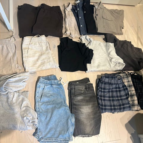 To t-skjorter, en shorts og to dressjakker