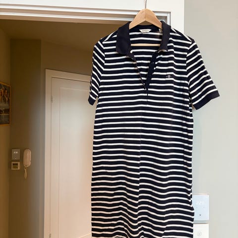 Moncler hverdagskjole for dame i størrelse XXL. Kjolen er laget av bomull og har en blå hovedfarge med kontrastdetaljer. Den har polokrage, knappestolpe foran og kort erm. Passer som en enkel og komfortabel hverdagskjole i casual stil.