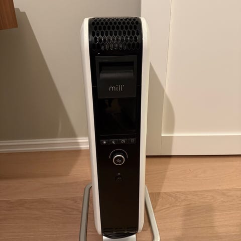 Mill oljeovn gulvmodell i frittstående utførelse. Ovnen har vertikal design med hvit ramme og svart frontpanel. Den er beregnet for oppvarming av innendørs rom og kobles til strøm via ledning. Egner seg for plassering på gulv i for eksempel stue, soverom eller kontor, der det er behov for jevn og elektrisk basert tilleggsvarme.