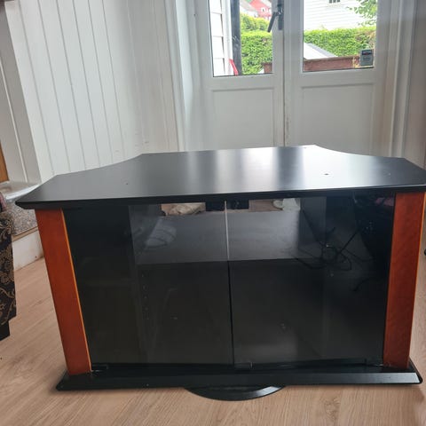 Selger en Tv benk. Den har ikke synlige skader og er brukt til å ha tv oppå, den er i svart stål og bordplaten er i glass.