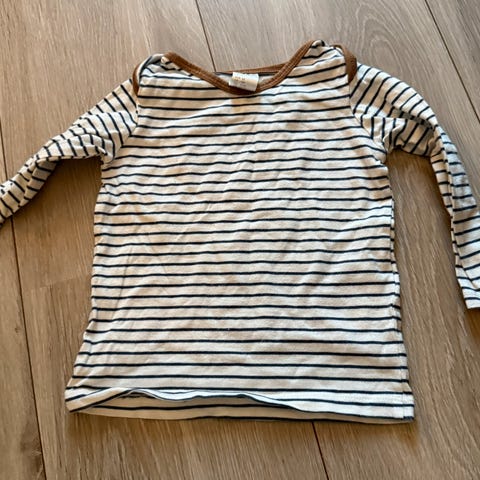 H&M genser for jente i størrelse 122. Genseren er hvit med smale, marineblå horisontale striper. Den er laget i bomull og har lange ermer og rund hals. Fine rysjer over skuldrene, kjempefin sommergenser! Pent brukt av ett barn.