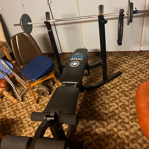 Abilica benkpress treningsbenk. Egnet til styrketrening hjemme, som benkpress og ulike beinøvelser. Vektstang følger med, veier 7kg.