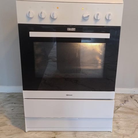 Gram keramisk komfyr med platetopp og stekeovn. Komfyren har keramisk topp med flere kokesoner og frontplasserte brytere for regulering av varme. Stekeovnen har glassdør som gir innsyn under bruk. Passer til standard kjøkkeninnredning med frittstående plassering mellom benkeskap. Egnet for vanlig matlaging og baking på kjøkken i bolig eller hytte.kan levere