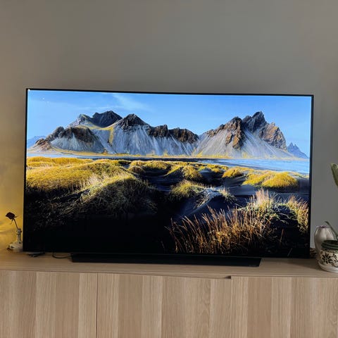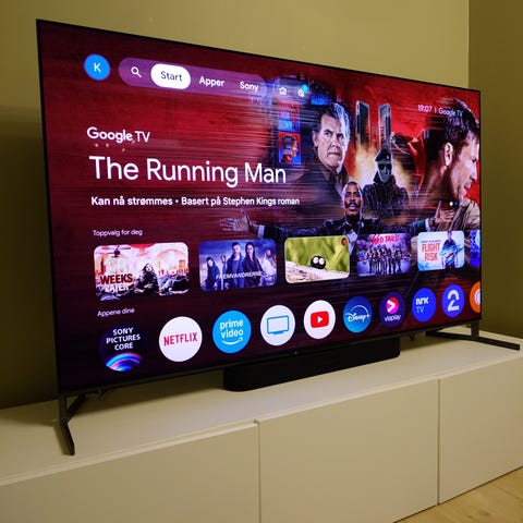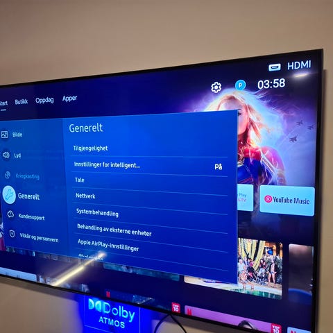 Samsung TV med flatskjerm og tynne rammer. Den har smart-TV-funksjoner med tilgang til ulike apper og strømmetjenester. Fjernkontroll og strømledning følger med.