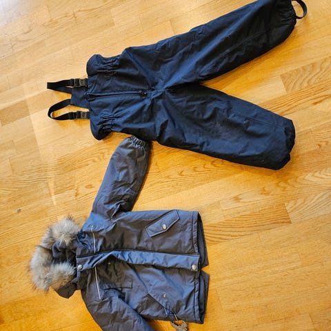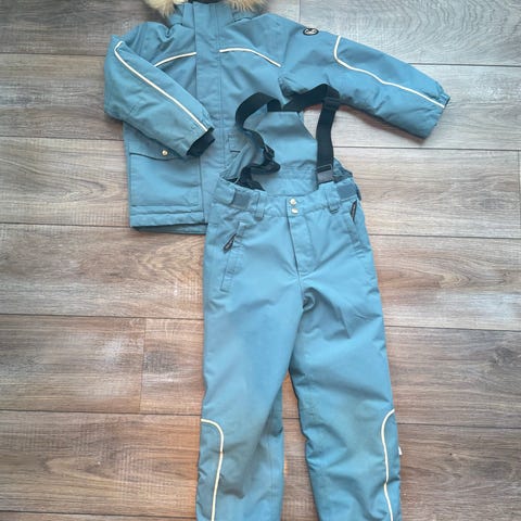 Jakka er pent og lite brukt. Buksa mer brukt og har noen anmerkninger som slitasje to små riper, slitasje på knær og på sømmen. Se bilder. Str 122. Selges 700kr