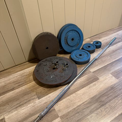 Trim Gym vektstang med vektskiver i metall. Stangen er rett og har flere runde vektskiver montert på hver side. Vektskivene er i støpejern/metall med preget Trim Gym-logo. Egner seg til styrketrening som markløft, roing, skulderøvelser og andre basisøvelser med frivekter. Passer til hjemmetrening eller enkel styrketrening i mindre treningsrom.Samlet vekt på skivene er 70 kilo . 4 •10 kilo , 2•5 kilo og 4•2 1/2 kilo