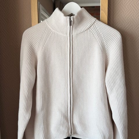Donna cardigan jakke for dame i størrelse L. Modellen er i ribbestrikket bomull, ull og nylon, med høy hals og glidelås i front. Fargen er lys rosa. Cardiganen har lange ermer og rett fasong, egnet som et lett ytterplagg eller som et ekstra lag inne.