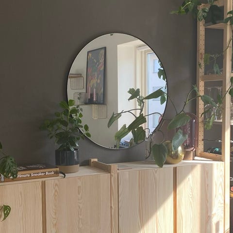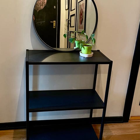 Elegant, rundt speil med en sort metallramme. Passer godt i alle rom. Diameter 70 cm