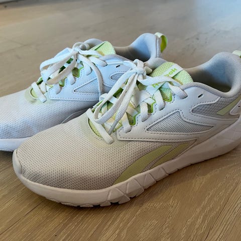 Reebok løpesko i størrelse 39. Skoene er i svart med hvite detaljer og hvit såle. Overdelen ser ut til å være i pustende mesh kombinert med syntetiske forsterkninger for støtte rundt foten. Modellen er egnet til løping og annen lett trening på hardt underlag. Nøytral løpesko med snøring og polstret hælkappe for bedre komfort under bruk.