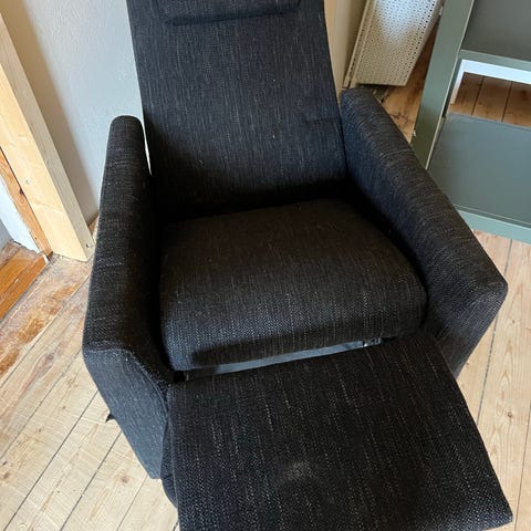 Hjellegjerde Living 100 Relaxer stol i mørk grå tekstil. Stolen har høy rygg med løs nakkepute og integrert fothviler som kan felles ut for økt komfort. Armlenene er rette og godt polstrede. Mekanismen gjør det mulig å regulere sittestilling fra oppreist til mer tilbakelent posisjon. Egnet som godstol i stue eller TV-krok, og gir støtte til rygg, nakke og ben ved lengre sitteseanser. Lite merke bak på ryggen (se bildet)ellers meget fin i stoffet. Nesten som ny.