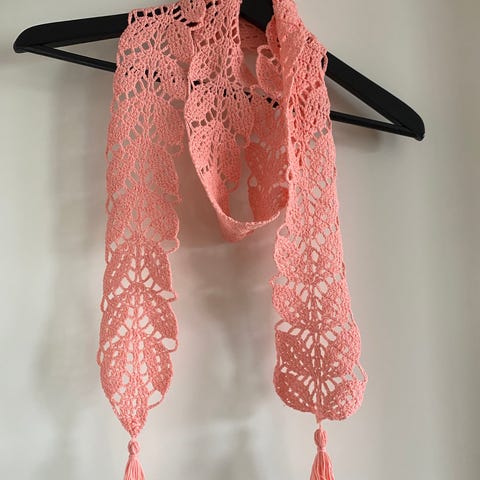 Nydelig, mykt og lett håndheklet skjerf i flotte nyanser av oransje, fersken og korall. Skjerfet har en luftig og delikat struktur som gjør det behagelig å bruke både inne og ute – perfekt som et lett tilbehør vår og høst, eller som en fargerik detalj på kjølige sommerkvelder.