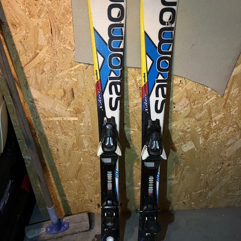 Salomon alpinski med tilhørende alpinstøvler og bindinger. Skiene har overflate i lilla med grafiske detaljer. Alpinstøvlene er svarte med flere justerbare spenner i metall og hvite detaljer. Bindingene er montert på skiene og tilpasset støvlene på bildene. Settet egner seg til vanlig alpinkjøring i bakke. Nøyaktig lengde på ski og størrelse på støvler er ikke oppgitt og bør måles ved behov.