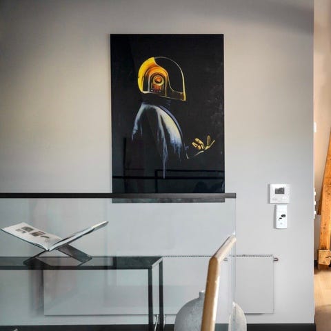 Denne er synlig ved nærmere ettersyn, men oppleves ikke dominerende når bildet henger på vegg.