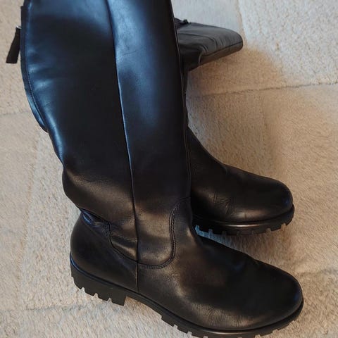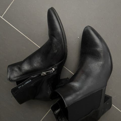 ECCO halvhøye støvletter i størrelse 38. Støvlene er i svart skinn med glidelås på siden for enkel av- og påtaking. De har mønstret yttersåle i gummi for godt grep og avtakbare innersåler med fargerikt mønster. Modellen har middels høy skaft og er egnet til bruk i kaldere værforhold.
