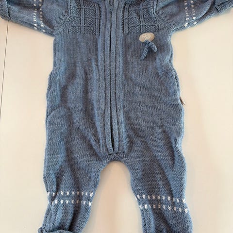 Lillelam ulldress unisex i størrelse 74. Heldress i blå ull med glidelås foran og lange ermer og ben. Ribbekanter ved ermer og ankler for bedre passform. Produktet er laget i ull, som gir god varme og komfort for barn. Passer til både innebruk og som mellomlag under yttertøy. Matcher medfølgende ullvotter i samme farge og materiale.