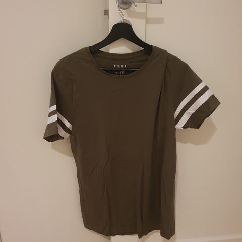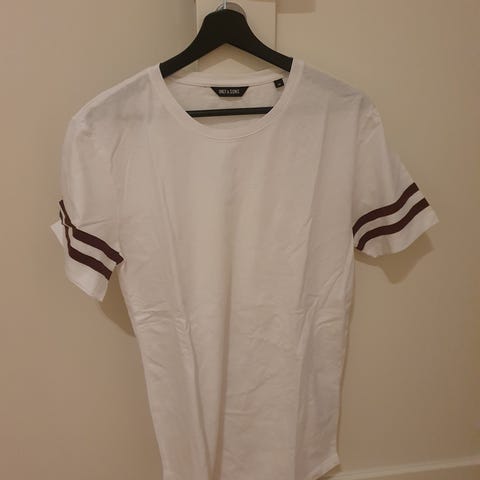 New Yorker T-skjorte for herre i grå farge, størrelse M. T-skjorten har rund hals og korte ermer med hvite striper på begge ermer. Passer til hverdagsbruk og kan kombineres med både jeans, joggebukse og shorts. Materialet fremstår som lett og egnet for bruk innendørs eller i mildt vær.