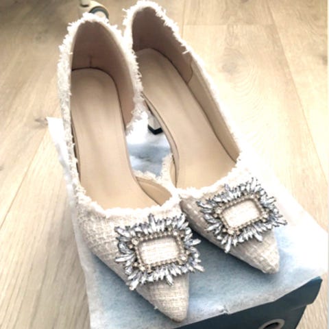 ASOS hæler i størrelse 36. Skoene er gjennomsiktige med spiss tå og dekorativ stjerneformet pynt foran. Overdelen er i plastmateriale med gjennomsiktige stropper rundt ankelen. Sålen er i syntetisk materiale med liten hæl. Egner seg som pensko eller til anledninger der man ønsker et mer pyntet uttrykk.