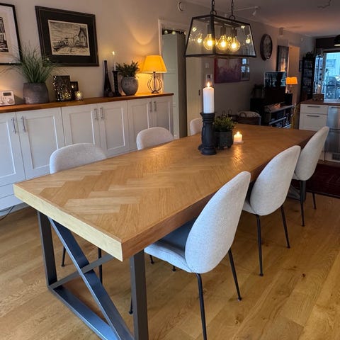 Mprgantown spisebord. Bordplaten er i tre med fiskebensmønster og eikefarget overflate. Understellet består av mørke skrå ben som gir god stabilitet. Passer som spisebord på kjøkken eller i spisestue. Følger også med 2 tilleggsplater på 44x90cm. Kun få bruksmerker som er vanskelig å se