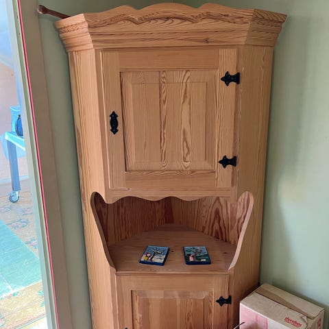 Hjørneskap tre med hylle og skuff