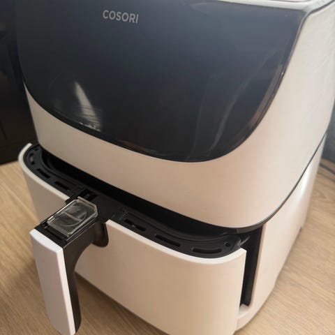 Philips airfryer i hvit og gull farge. Modellen har frontpanel med dreieknapp og flere funksjonsknapper for ulike programmer. Utskuffen har non-stick belegg og avtakbar kurv med rist for jevn tilberedning av mat. Egnet til steking, grilling og oppvarming av ulike typer mat ved hjelp av varmluft. Passer på kjøkkenbenk og kobles til vanlig stikkontakt.