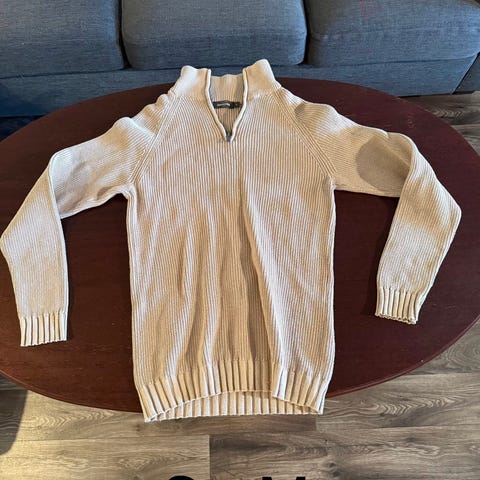 Dæhlie genser for herre i 50% ull/50% akryl, størrelse L. Genseren er offwhite og har glidelås i halsen. Strikket struktur i stoffet gir et tydelig mønster på for- og bakside. Vertikalt Dæhlie-logo på ryggen. Egner seg godt som mellomlag eller varm fritidsgenser i kjølige temperaturer.