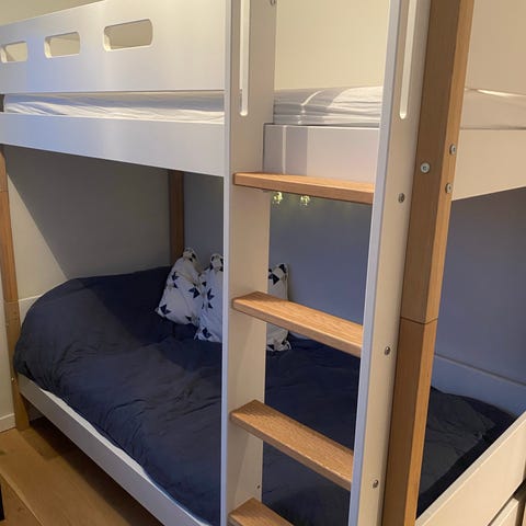 IKEA køyeseng for barn i hvit utførelse. Sengen har to liggeplasser, med øvre køye tilgjengelig via stige på siden. Under nederste køye er det en uttrekkbar skuff som kan brukes til oppbevaring eller eventuell ekstraseng, avhengig av innredning. Passer til barnerom der man ønsker to soveplasser på liten gulvflate. 200x 75. Madrasser følger ikke med. Må hentes i Sandefjord.