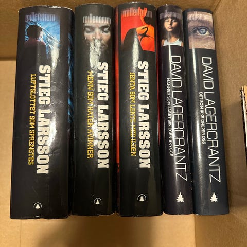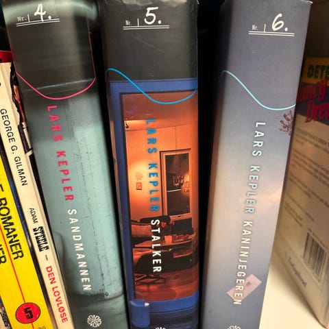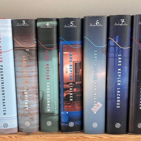 Bokserie av Lars Kepler med innbundne krimromaner. Flere titler i serien står samlet i hyllen. Bøkene er i standard innbundet størrelse og egner seg for lesing og samling av krimlitteratur.