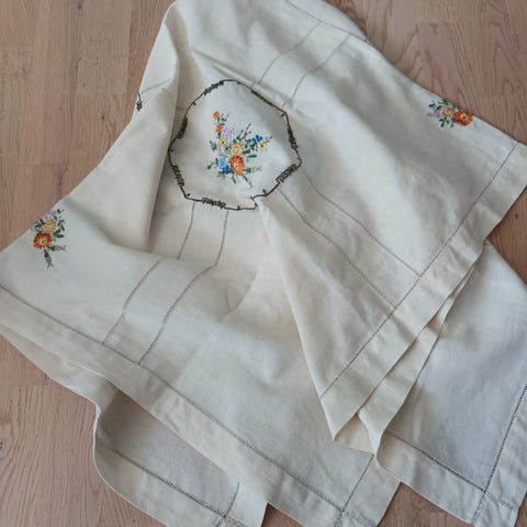 Denne nydelig duken er perfekt for vår/sommer. Den har et par fleker som vises på de siste 2 bilder men siden de er ganske små var det vanskelig å vises frem på bildene. Kan lett fjernes i vasken ellers i veldig bra stand. Duken er oval i form. 124X100cm. 100% bomull