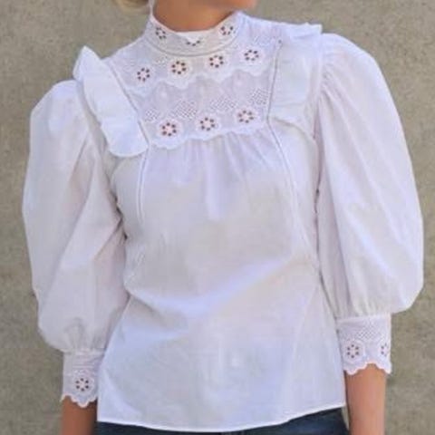 Modellen har voluminøse ermer, vakre broderier på bryst og ermer, samt delikate volanger over skuldrene. Laget i 100 % bomull, som gjør den lett og behagelig å ha på.