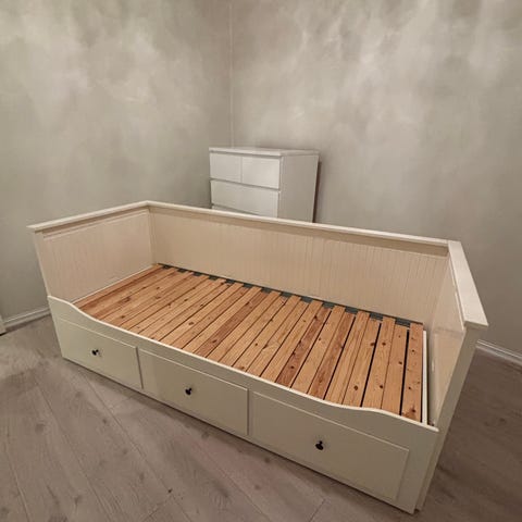 Hemnes hvit dagseng fra Ikea med 3 oppbevaringsskuffer. Sengen har rygg- og sidepaneler som gjør at den kan brukes både som sofa på dagtid og seng om natten. Under sengen er det tre uttrekksskuffer som gir ekstra oppbevaringsplass til sengetøy eller annet utstyr, og sengen er uttrekkbar.