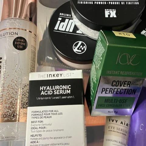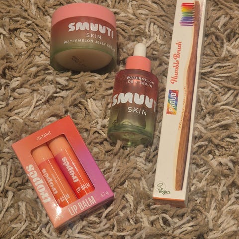 Pakke med diverse sminke- og hudpleieprodukter i rosa fargetoner. Bildet viser blant annet ansikts- og leppemasker, øyepads og sminkesvamper, samt en sprayflaske. Produktene egner seg til enkel hudpleie og påføring av sminke. Alle produkter er i kompakt størrelse som passer godt på baderommet eller i toalettmappen.