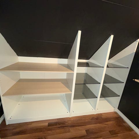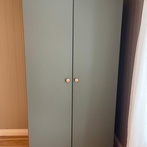 Trådskuffer, hyller, garderobestang og skohyller. 1000kr for begge stammene samlet.
