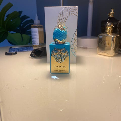 Stephane Humbert Lucas God of Fire parfyme på 50ml. Eau de parfum i original flaske med turkis/blå rektangulær glassflaske og dekorativ gullfarget detalj på fronten. Leveres i original eske merket «God of Fire» fra Stephane Humbert Lucas Paris. Ekstremt god duft til sommeren, selges da jeg har 2 stk er igjen cirka 45ml