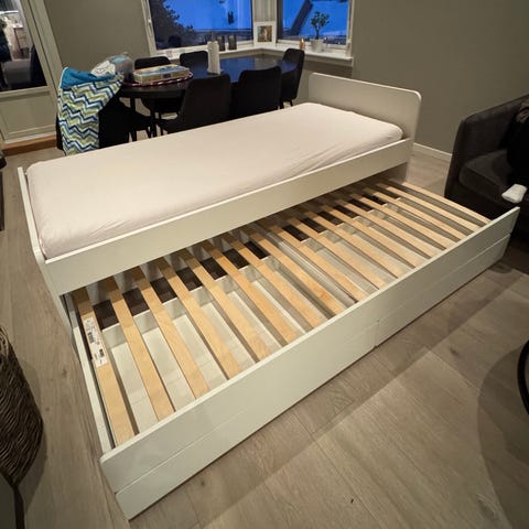 Pent brukt Flexa Nor køyesenga med ekstra høyde, 184 cm. Sengen er i fargen hvit med ben og trapp i eik. Lakken er vannbasert og fri for kjemikalier. Flott og praktisk seng.