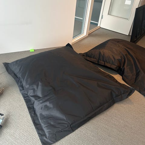 2 stk store og gode saccosekker i denim-stoff selges billig.