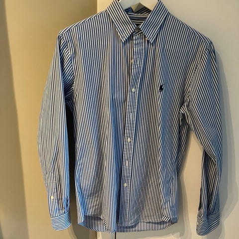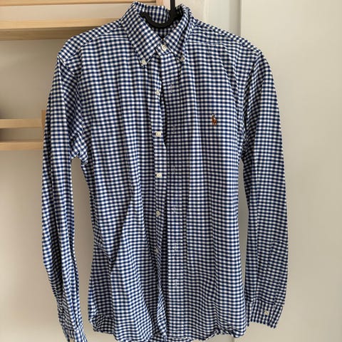 Ralph Lauren skjorte for herre i størrelse S. Skjorten er i blått rutemønster og laget av bomull. Klassisk modell med krage, knappelukking foran og lange ermer. Brodert logo på brystet. Passer til både hverdag og mer formelle anledninger.