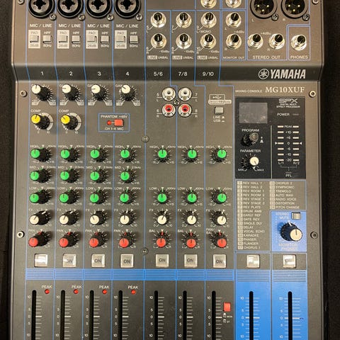 Yamaha MG06 mikser. Kompakt analog mikser med 6 kanaler, hvorav 2 mikrofon/instrumentinnganger med XLR/jack og gainkontroll, samt linjeinnganger på jack/RCA. Separate nivåkontroller per kanal, 2-bånds EQ på mono-kanaler, pan/balanse og hovedvolum. Hovedutgang på jack, hodetelefonutgang med egen nivåkontroll og LED-nivåindikator for hovedsignal. Egnet for enkel lydmiksing til for eksempel små opptak, øving eller mindre lydoppsett.