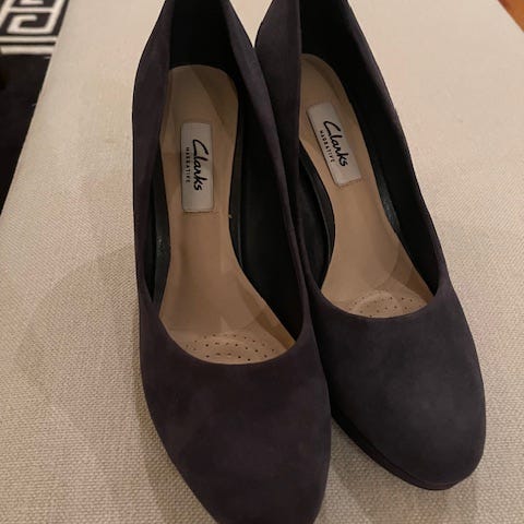 Clarks pumps hæler i størrelse 37. Skoene har lukket tå og hæl, og kommer i en mørk blå farge. Overdel i et semsket materiale, med innersåle i lysere materiale. Klassisk modell med middels høy hæl som passer til bruk ved ulike anledninger. Vil kanskje si at de er mer 36,5 i størrelse