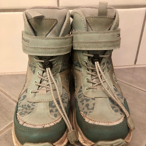 Str 32/33. Slitt og mye brukt, men gode som reservesko. Veldig lette sko. Vanntette.
