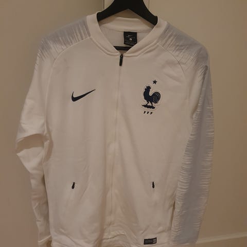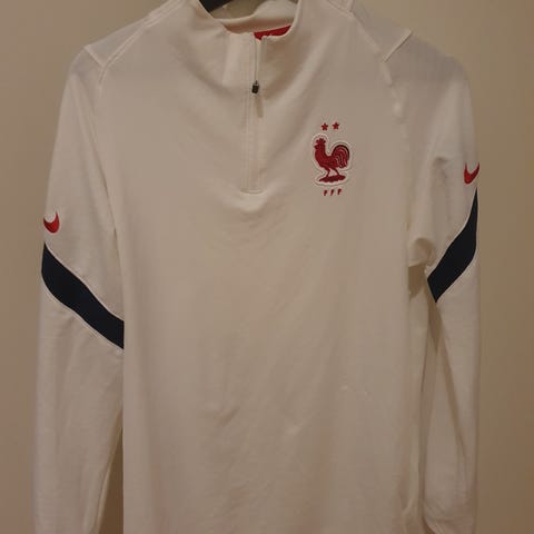 Nike Frankrike fotballdrakt for herre i størrelse L. Drakten er hvit med detaljer i blått og rødt langs sidene, samt landslagslogo på brystet. Kortermet modell egnet til fotball og annen fysisk aktivitet.