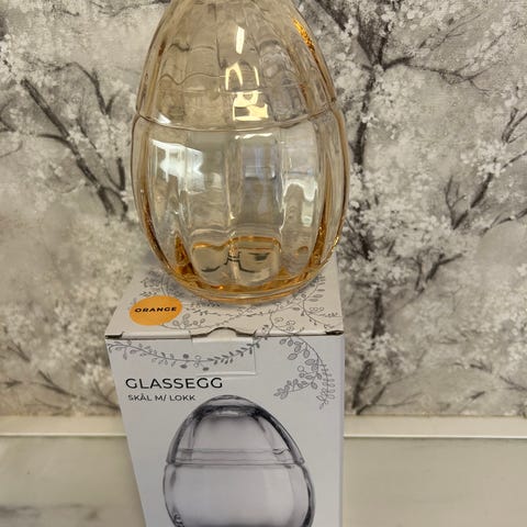 Selger eggformet pynt i håndlaget glass. Gul farge med fine fargedetaljer inni. Merket Lorup Handmade, etiketten sitter fortsatt på.