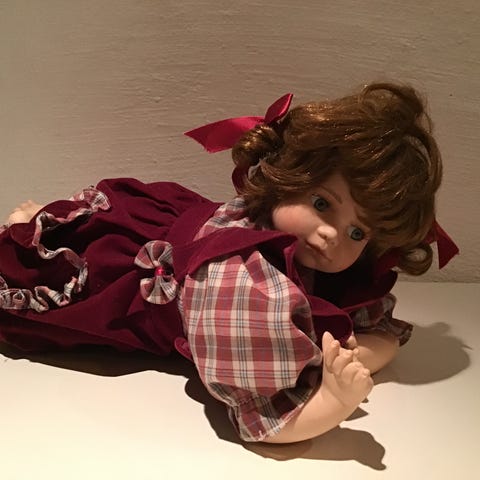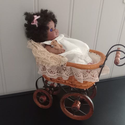 Hel porselendukkebaby liggende i gammeldags vogn selges