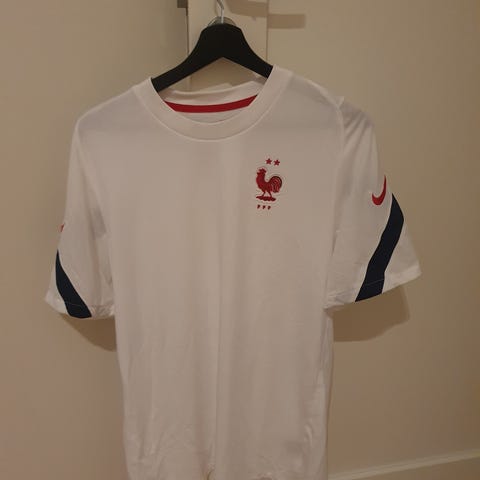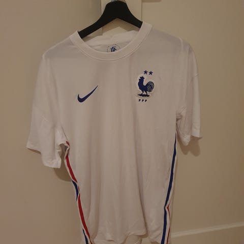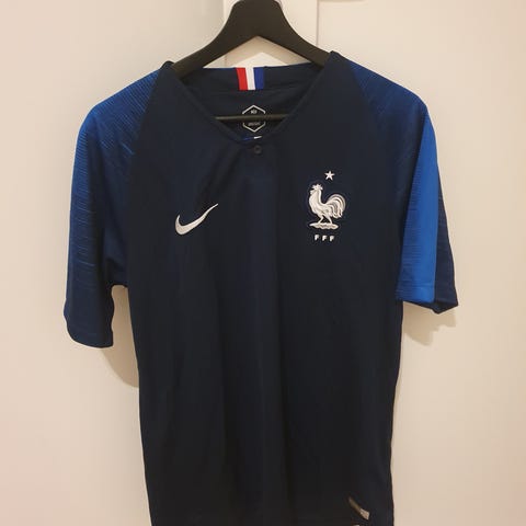 Nike Frankrike Griezmann 7 fotballdrakt for herre i størrelse M. Drakten er i blå farge med hvit nummer 7 på front og rygg, samt navnet Griezmann på ryggen. Landslagslogo og Nike-logo på brystet. Kortermet modell egnet til fotball og annen fysisk aktivitet.