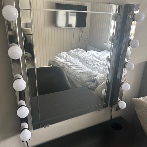 Selger dette flotte speilet med LED-lys – perfekt til sminke, styling eller som stemningsfull belysning på soverommet. Speilet har tre ulike lysinnstillinger: